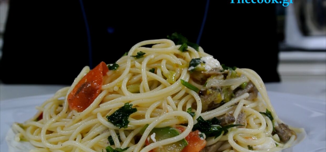 Υλικά 500γρ. Σπαγγέτι 300γρ. μανιτάρια πλευρώτους 250γρ. κολοκυθάκια 100γρ. πράσο 1 μικρό κρεμμύδι 1 σκελίδα σκόρδο 2 μικρές ντομάτες 110γρ. ελαιόλαδο Αλάτι Πιπέρι 30γρ μαϊντανό 170γρ. φέτα νηστίσιμη Εκτέλεση Σε μια κατσαρόλα βάζουμε νερό να βράση μαζί με αρκετό αλάτι Όταν πάρει βράση το νερό ρίχνουμε τα σπαγγέτι και τα