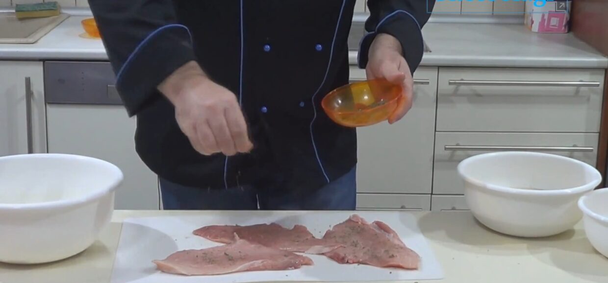 3. αλατοπιπερόνουμε τα κομμάτια του κρέατος και τα περνάμε από το αλεύρι