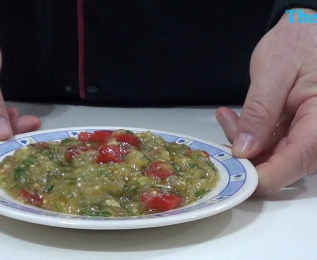 Υλικά: 800 γρ. μελιτζάνα 120 γρ. ελαιόλαδο 1 μεγάλη πιπεριά φλωρίνης ½ ματσάκι μαϊντανό Αλάτι 1 σκελίδα σκόρδο 30-40 γρ. ξύδι Εκτέλεση: Βάζουμε την ψημένη